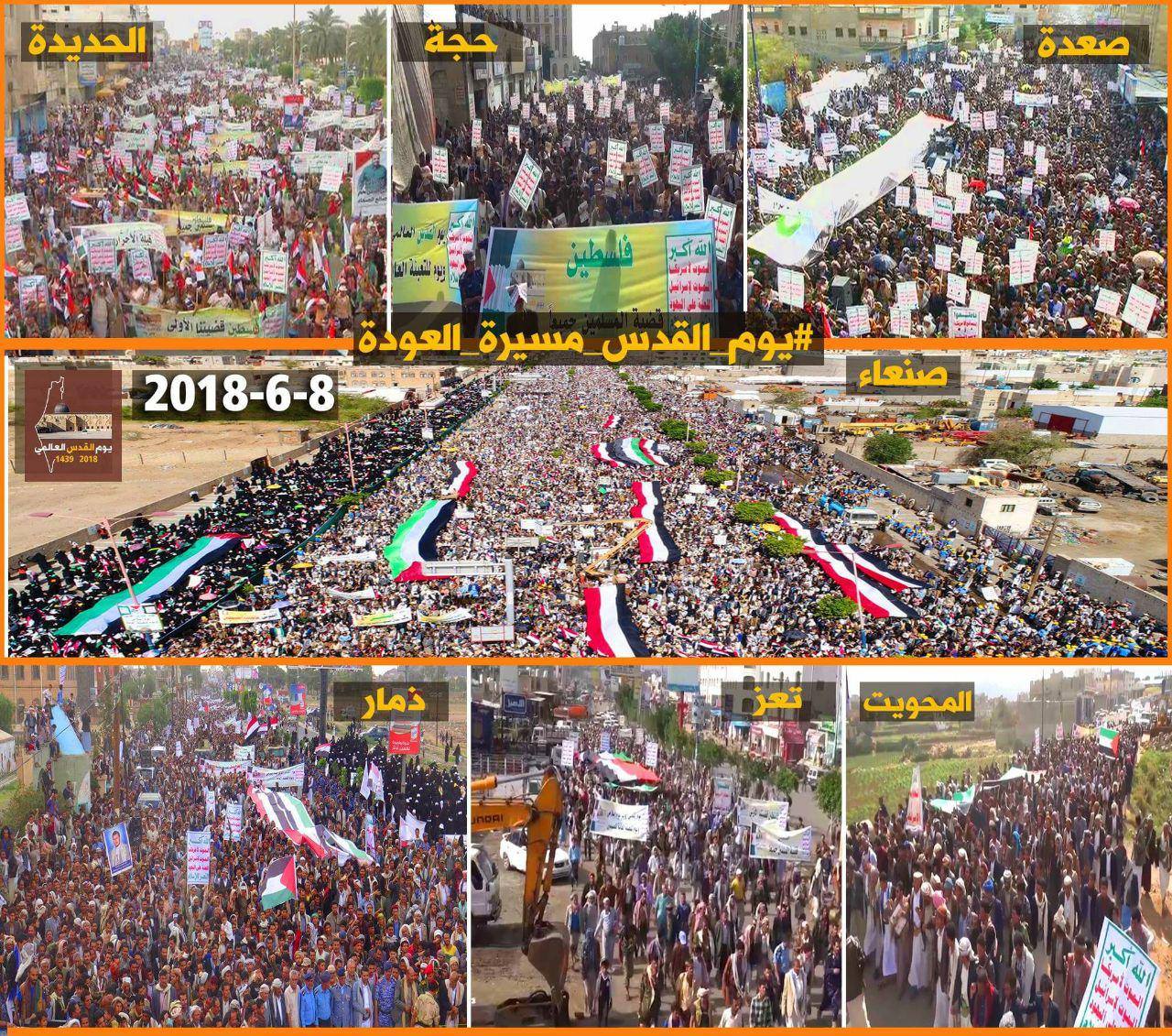 شهدت المدن اليمنية خروج مئات الآلاف من اليمنيين في يوم القدس العالمي وكانت مظاهرات اليمن هي أكبر مظاهرات شهدها العالم نصرة للقدس وفلسطين المحتلة على الرغم من الظروف التي يعيشها اليمن في ظل استمرار العدوان عليه للعام الرابع على التوالي، وهو الأمر الذي أثار دهشة العالم العربي ونخبه السياسية والفكرية وقادة الرأي.