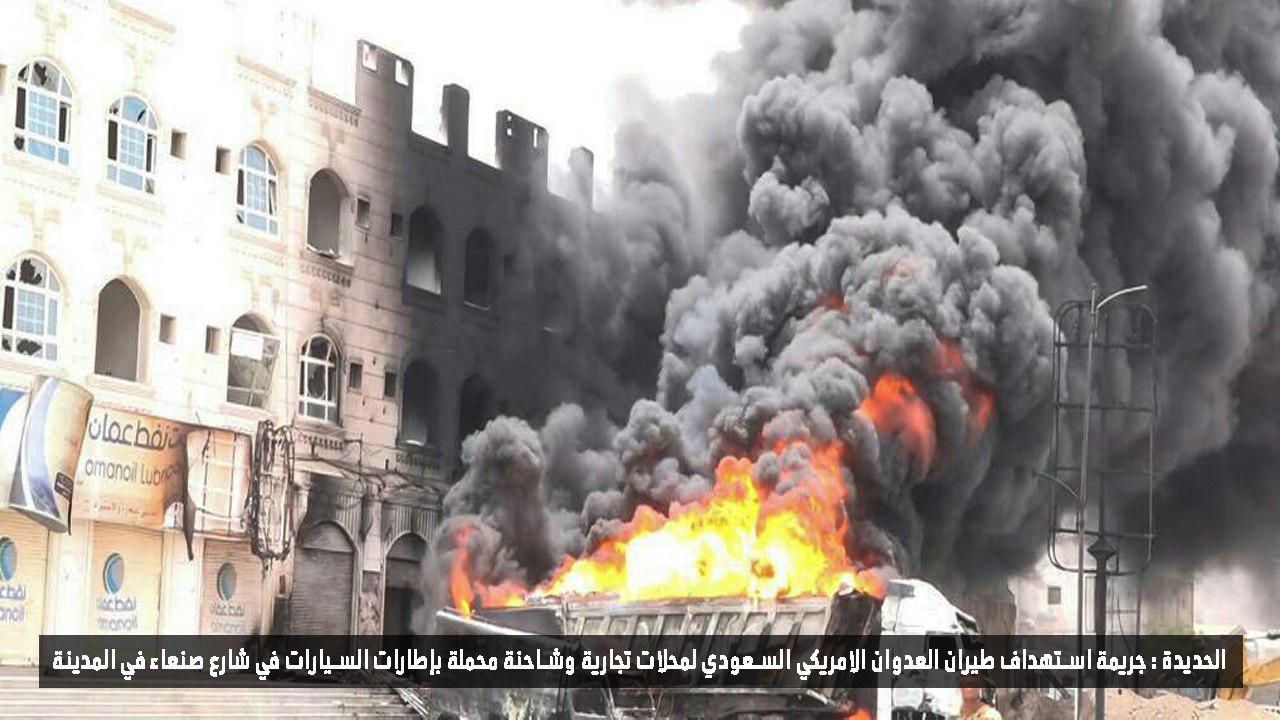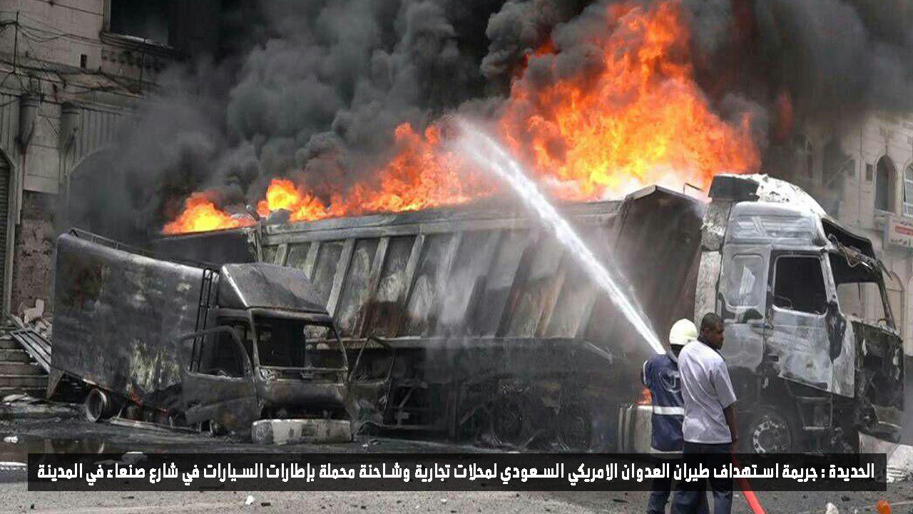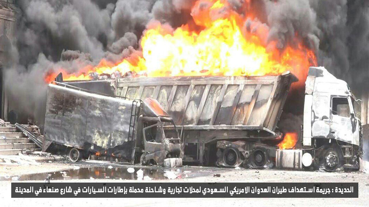 وأكد مصدر أمني بالمحافظة ” أن طيران العدوان استهدف بغارتين جويتين ناقلة كان عليها عمال ينقلون الإطارات والزيوت من أحد المحلات التجارية بالقرب من جولة يمن موبايل، ما أدى إلى استشهاد وجرح 17 شخص وتضرر المحلات المجاورة.