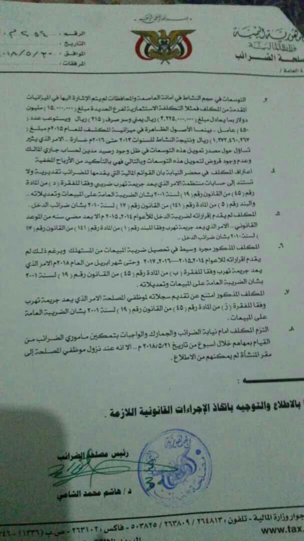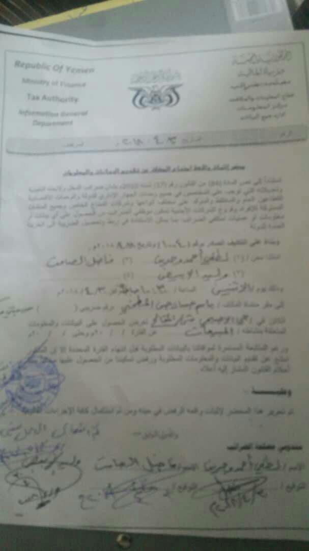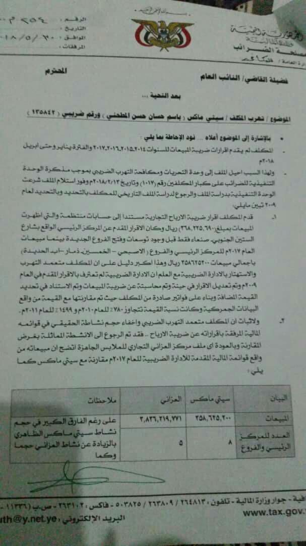 إحدى الوثائق، التي نشرها موقع “يمانيون”، وهي مذكّرة صادرة عن رئاسة مصلحة الضرائب ومرسلة الى وكيل نيابة الضرائب والجمارك والواجبات الزكوية، تُبلغه بامتناع المطحني بشكل متكرر عن تمكين اللجان المكلفة من الضرائب من الاطلاع عن حجم المبيعات الفعلي لمحلات “سيتي ماكس”، وأن اللجنة قامت بإجراء محضر امتناع بذلك ، حيث وأن مهام اللجنة تأتي وفقاً للقوانين والتشريعات الضريبية بالبلاد.