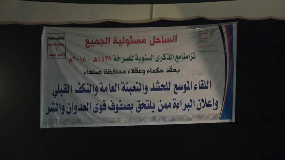 بحضور محافظ محافظة صنعاء الشيخ حنين قطينه . وتزامنا بالذكرى السنويه للصرخه عقد حكماء وعقلاء محافظة صنعاء صباح اليوم بقاعة جمال عبدالناصر بالجامعه القديمه بالعاصمة صنعاء لقاءا موسعا للحشد والتعبئة العامه الی جبهات الساحل وكل الجبهات وإعلان النكف القبلي لصون الأعراض والدماء وإعلان البراءة من كل عميل ومرتزق انضم في صفوف العدوان والعماله ..