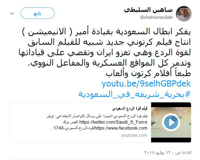 ووصف “شاهين السليطي” ولي العهد السعودي محمد بن سلمان بـ”امير الانيميشن” وغرد قائلا: “يفكر ابطال السعودية بقيادة أمير ( الانيميشن) انتاج فيلم كرتوني جديد شبيه للفيلم السابق لقوة الردع وهي تغزو ايران وتقضي على قياداتها وتدمر كل المواقع العسكرية والمفاعل النووي. طبعاً أفلام كرتون وألعاب”.