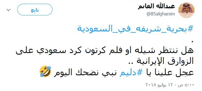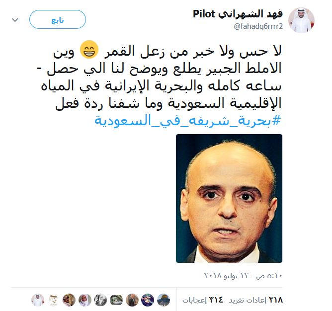 ووضع فهد الشهراني صورة لوزير الخارجية السعودي عادل الجبير وكعلق قائلا: “لا حس ولا خبر من زعل القمر وين الاملط الجبير يطلع ويوضح لنا الي حصل – ساعه كامله والبحرية الإيرانية في المياه الإقليمية السعودية وما شفنا ردة فعل”.