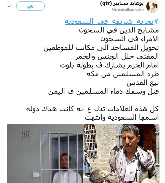 من جانبه انتقد ” بوعابد سنايبر” الوضع الذي آلت له السعودية مع صعود محمد بن سلمان الى الحكم وسفك دماء اليمنيين والتفريط بالقدس وقال: “مشايخ الدين في السجون الامراء في السجون تحويل المساجد الى مكاتب للموظفين المفتي حلل الجنس والخمر امام الحرم يشارك ف بطولة بلوت طرد المسلمين من مكه بيع القدس قتل وسفك دماء المسلمين ف اليمن كل هذه العلامات تدل ع انه كانت هناك دوله اسمها السعودية وانتهت”.