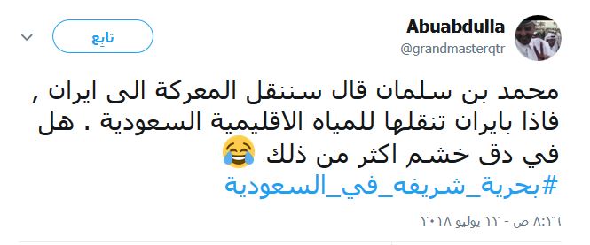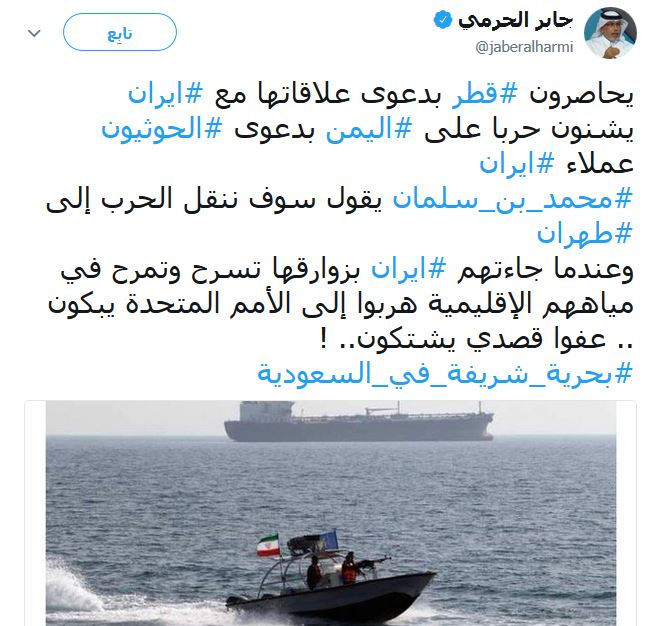 وسخر “جابر الحرمي” من كلام كان قد قاله محمد بن سلمان في إحدى لقاءاته الصحفية عن نقل الحرب الى طهران وغرد قائلا: “يحاصرون #قطر بدعوى علاقاتها مع #ايران يشنون حربا على #اليمن بدعوى #الحوثيون عملاء #ايران #محمد_بن_سلمان يقول سوف ننقل الحرب إلى #طهران وعندما جاءتهم #ايران بزوارقها تسرح وتمرح في مياههم الإقليمية هربوا إلى الأمم المتحدة يبكون .. عفوا قصدي يشتكون.. !”