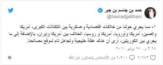 وكتب المسؤول القطري السابق في حسابه على “تويتر”: “مما يجري حولنا من خلافات اقتصادية وعسكرية بين التكتلات الكبرى، أمريكا والصين، أمريكا وأوروبا، أمريكا وروسيا، الخلاف بين أمريكا وإيران، بالإضافة إلى ما يجري بين الكوريتين، أرى أن هناك غفلة خليجية وتجاهل تام لموقع مصالحنا”.