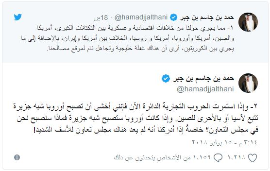 وتابع: “إذا استمرت الحروب التجارية الدائرة الآن، فإنني أخشى أن تصبح أوروبا شبه جزيرة تتبع لآسيا أو بالأحرى للصين. وإذا كانت أوروبا ستصبح شبه جزيرة فماذا سنصبح نحن في مجلس التعاون؟ خاصةً إذا أدركنا أنه لم يعد هناك مجلس تعاون للأسف الشديد!”.