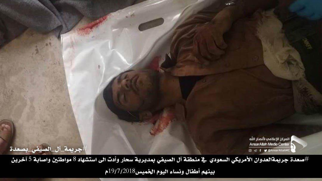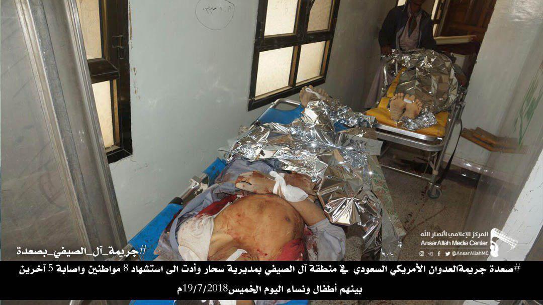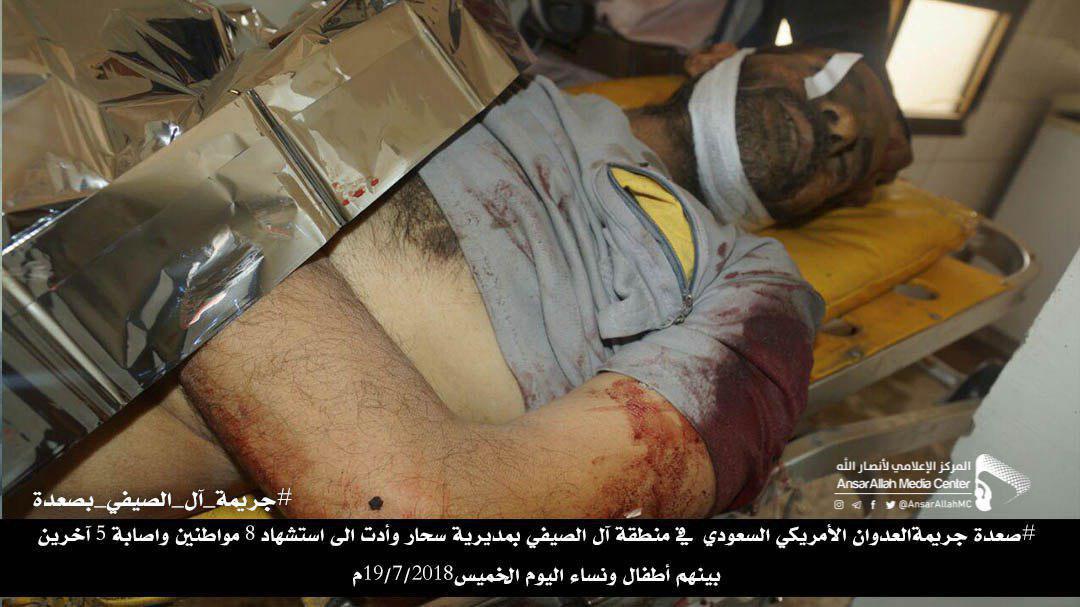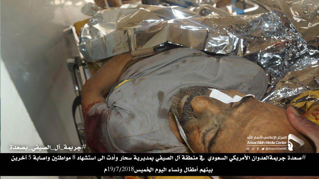 وأفاد مصدر محلي في صعدة عن استشهاد 8 مواطنين وإصابة 5 بينهم أطفال ونساء جراء غارة لطيران العدوان استهدفت منزلا في منطقة آل الصيفي بمديرية سحار.
