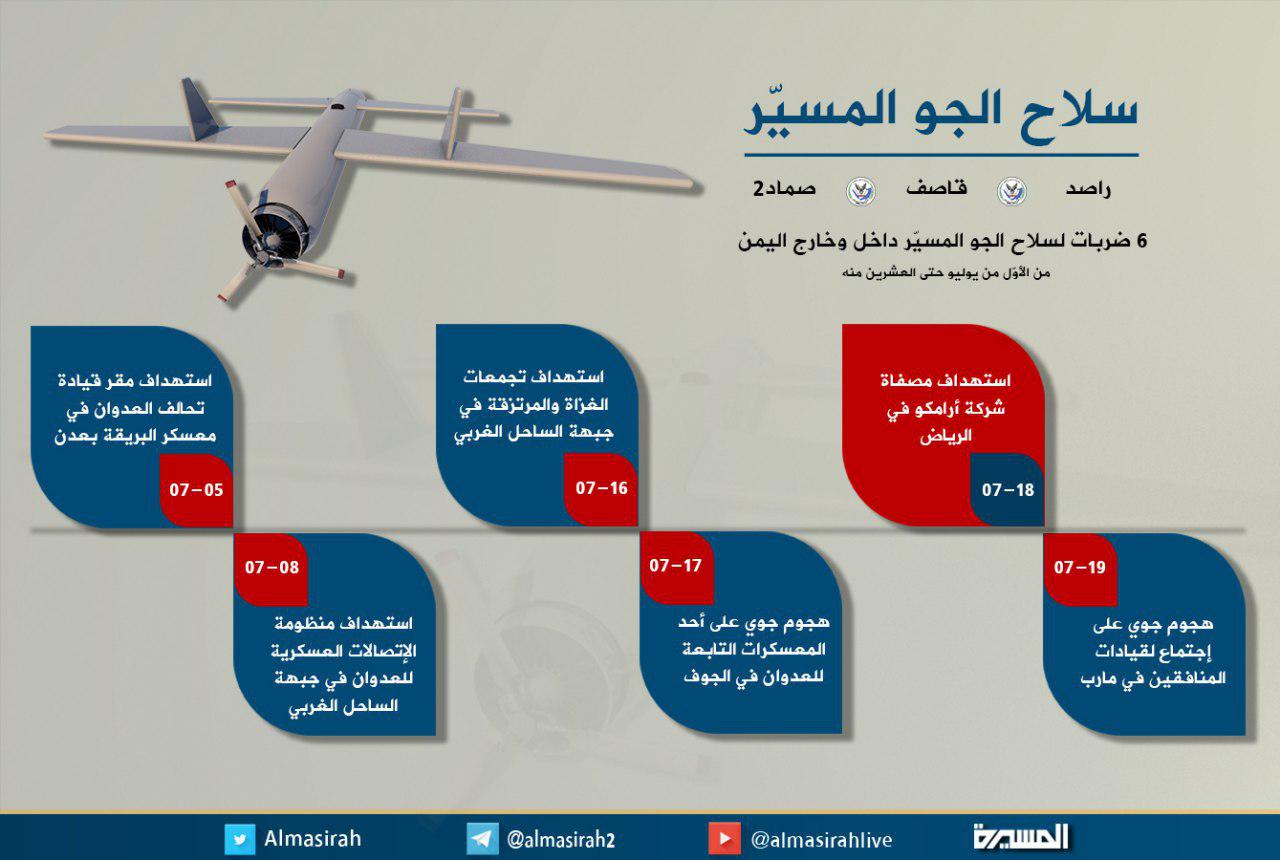ويعد هذا الانجاز النوعي للطائرات المسيرة اليمنية الذي تمثل بأستهداف قيادات مرتزقة العدوان السعودي أثناء عقدهم إجتماعا في القصر الجمهوري بمدينة مأرب ما أدى الى مقتل واصابة من كان بداخله.