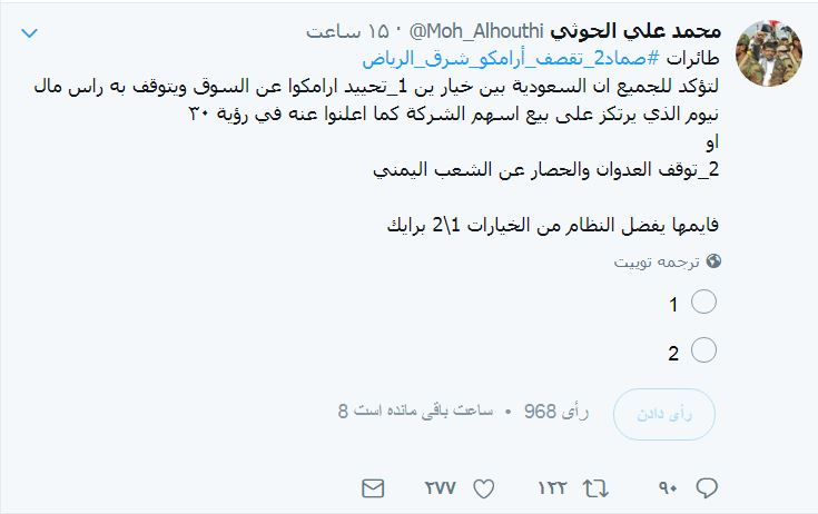 وقال الحوثي في تغريدة عبر “تويتر”، إن “طائرات صماد2 قصفت أرامكو شرقي الرياض، لتؤكد للجميع أن السعودية بين خيارين”.