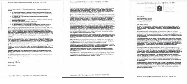 الي ذلك بعث سفير الإمارات في واشنطن يوسف العتيبة في السابع العشرين من حزيران الفائت برسالة إلى أعضاء في الكونغرس بالغ فيها بالتطمين إلى استمرارية وصول المساعدات إلى المدنيين في الحديدة طالباً مساندة الكونغرس لاستمرار العملية الجارية في الساحل الغربي. الرسالة وصلت الى أعضاء من الحزبَين الجمهوري والديمقراطي في لجان الشؤون الخارجية والاستخبارات والقوات المسلحة في غرفتي الكونغرس.