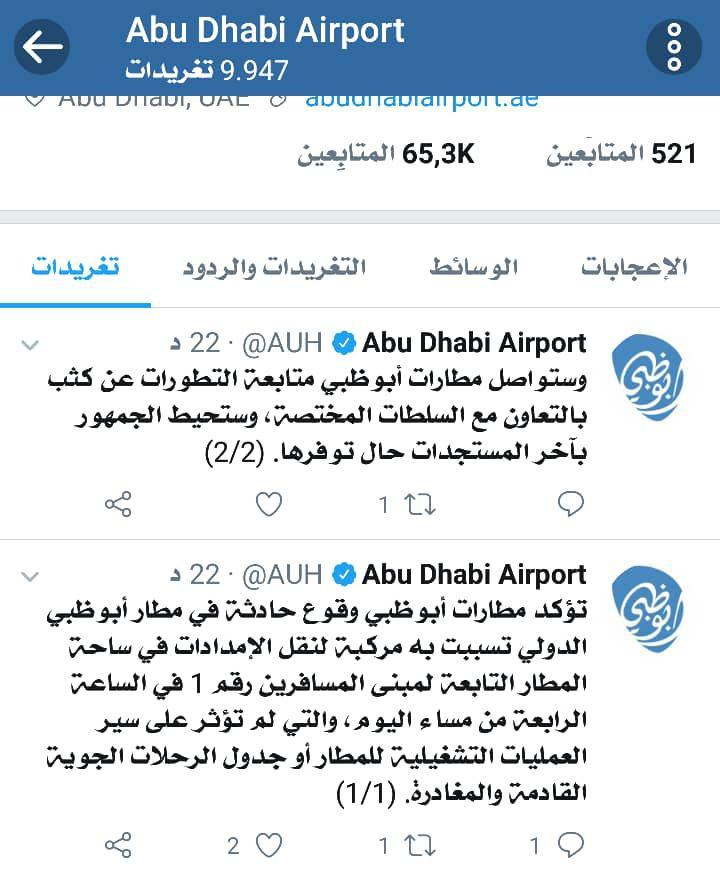 ونشرت “مطارات أبو ظبي” تغريدتين، عبر حسابها الرسمي على موقع “تويتر”، أعلنت فيها وقوع ما أسمته “حادثة” في مطار أبو ظبي الدولي.