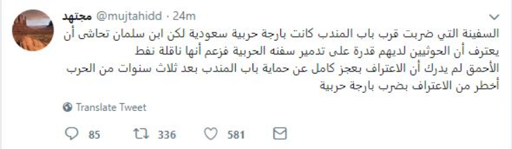وفي تعليق على موقع التواصل الإجتماعي “تويتر” قال مجتهد، أنّ “السفينة الّتي ضُربت قرب باب المندب، كانت بارجة حربية سعودية، لكن ولي العهد السعودي الأمير محمد بن سلمان تحاشى أن يعترف أنّ “حركة أنصار الله” لديهم قدرة على تدمير سفنه الحربية، فزعم أنّها ناقلة نفط”.