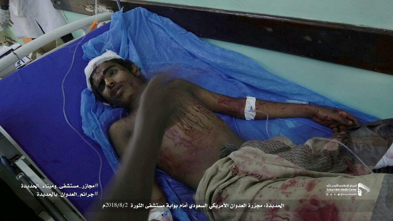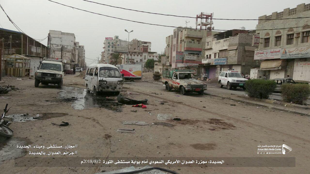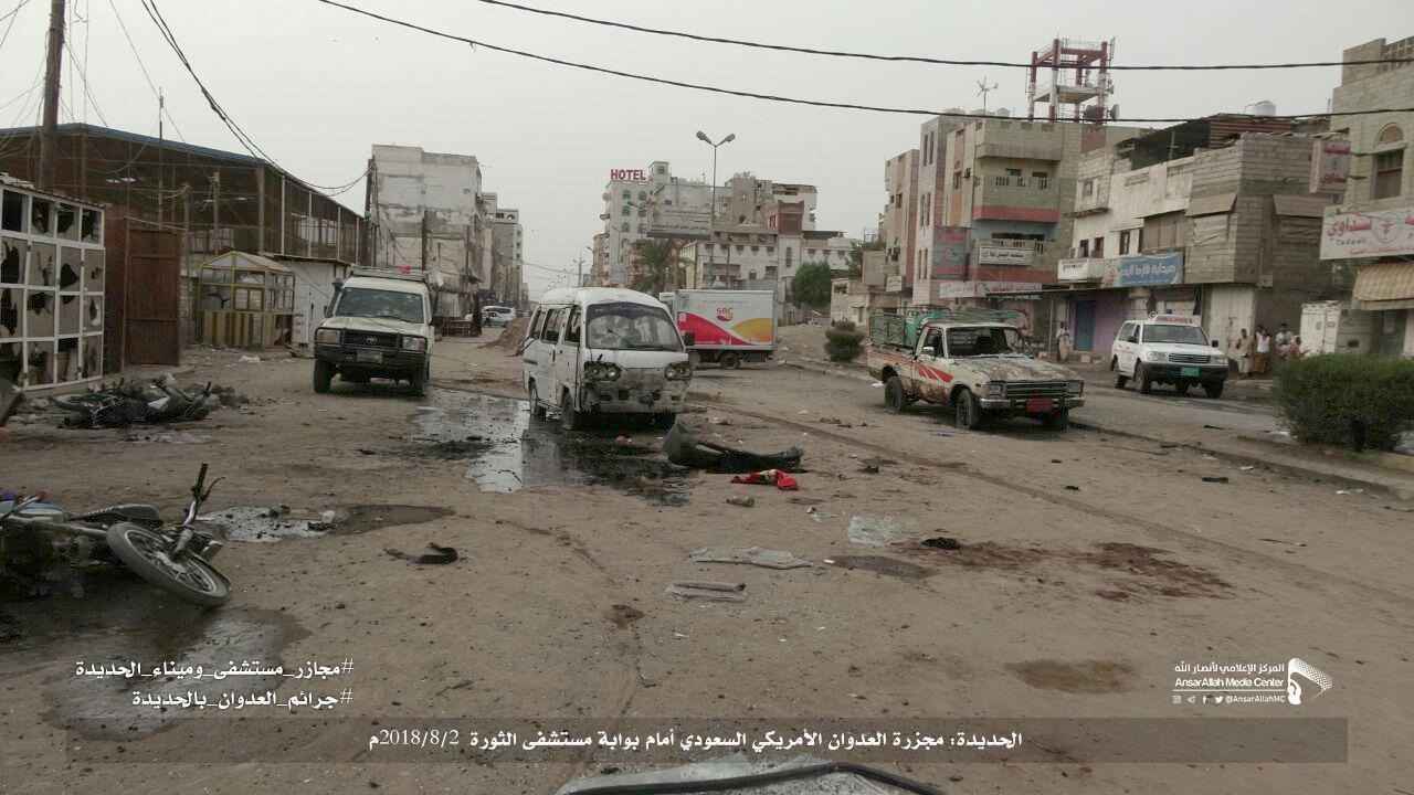 من جانبه، اعتبر الناطق الرسمي باسم وزارة الصحة اليمنية، الدكتور يوسف الحاضري، أن المجزرة “جريمة نكراء ارتكبها العدوان عندما استهدف بوابة مستشفى الثورة في الحديدة والتي تكتظ بعشرات البائعين والمرضى وذويهم”.