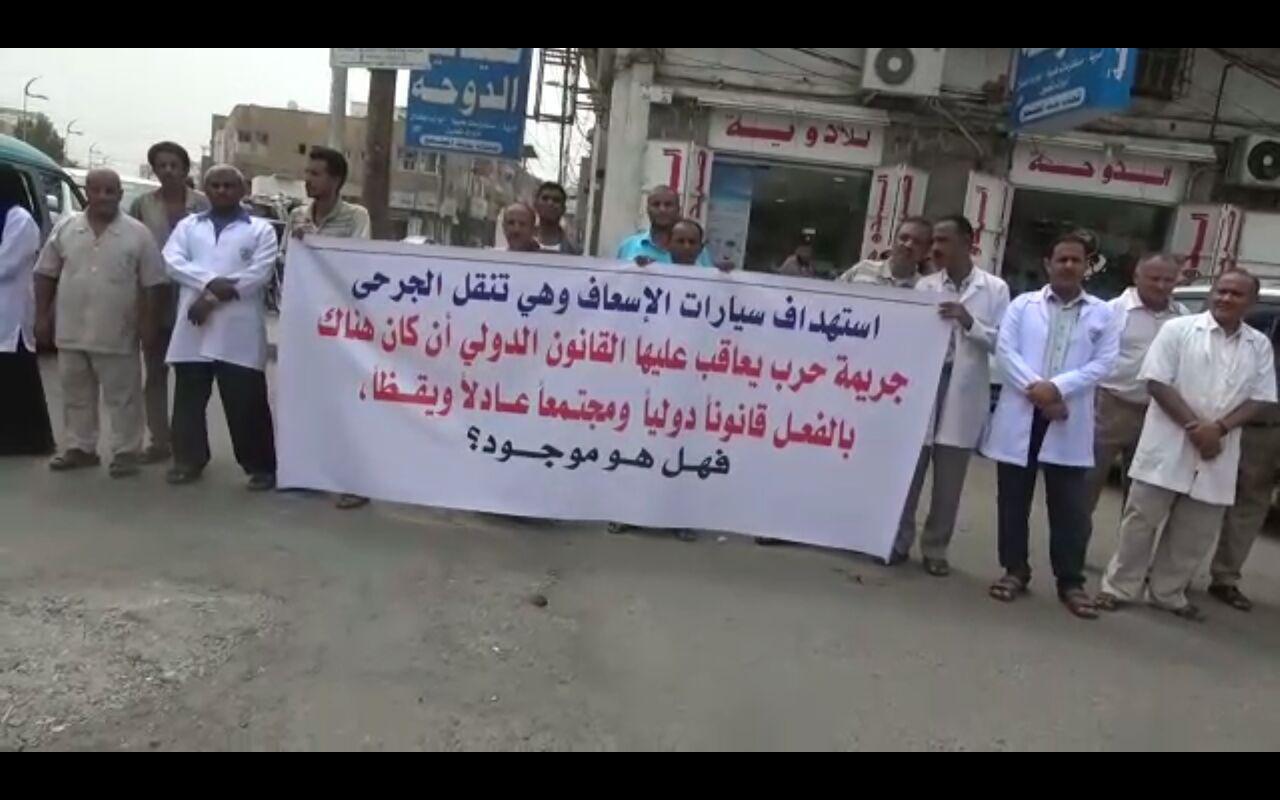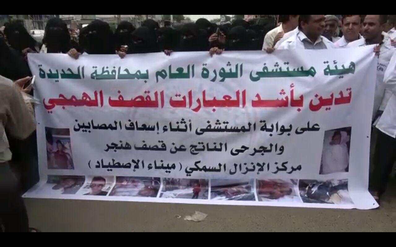 نفذت الكوادر الصحية في هيئة مستشفى الثورة بالحديدة والمراكز التخصصية التابعة لها وقفة احتجاجية تنديدا بمجزرتي بوابة الهيئة وسوق الصيادين.