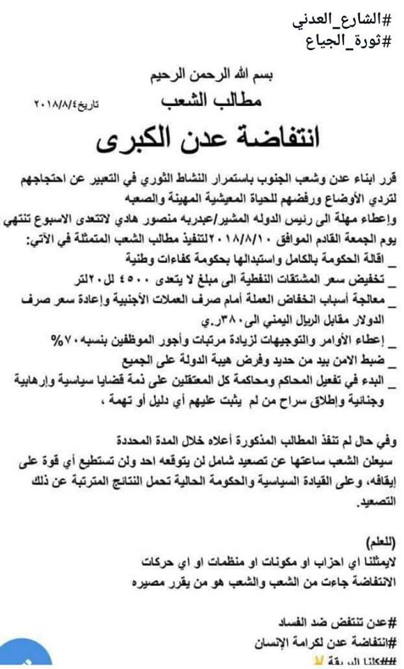 بدأت في مدينة عدن ملامح انتفاضة وثورة غضب ضد سياسة حكومة هادي وقوي تحالف العدوان السعودي حيث خرج المئات في عدد من مديريات المحافظة يطالبون بـخفض أسعار الوقود والحفاظ على العملة المحلية ورفع المرتبات وتحقيق الأمن في المدينة وإطلاق المعتقلين.