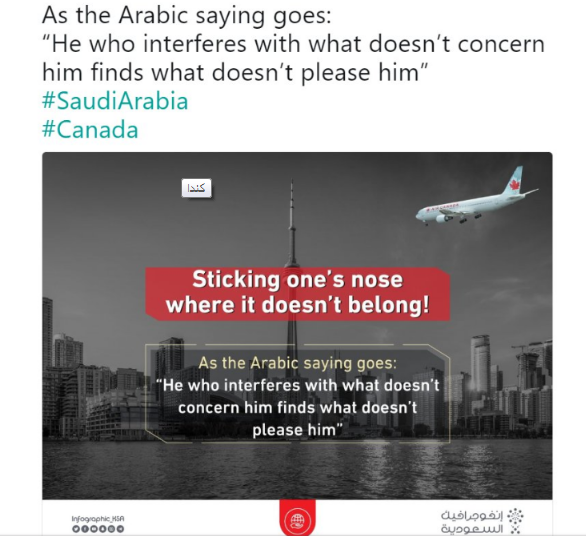 وجاء في تغريدة الحساب السعودي “من تدخّل فيما لا يعنيه، سمع ما لا يرضيه”، وأرفقت التغريدة بصورة ظهرت في خلفيتها طائرةٌ مدنيةٌ تابعةٌ للخطوط الجوية الكندية في طريقها للاصطدام ببرج “CN” الواقع في مدينة تورونتو الكندية.