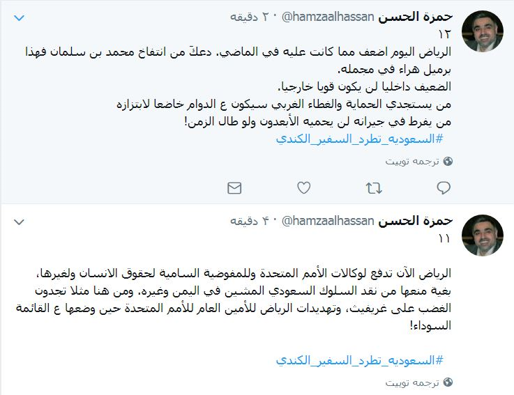 وتابع في سلسلة تغريداته على (تويتر):ترى هل كان قرار ابن سلمان موفقا في لجم كندا ومن وراءها من الدول الغربية؟! كلا! لقد اثبت بقراراته تجاه كندا انه انتقائي اختار الأضعف، ولم يجرؤ على الأقوى. اذا اخمد صوتا واحدا فهو لن يخمد بقية الأصوات التي تراه ضعيفا وفرصة دائمة للإبتزاز.