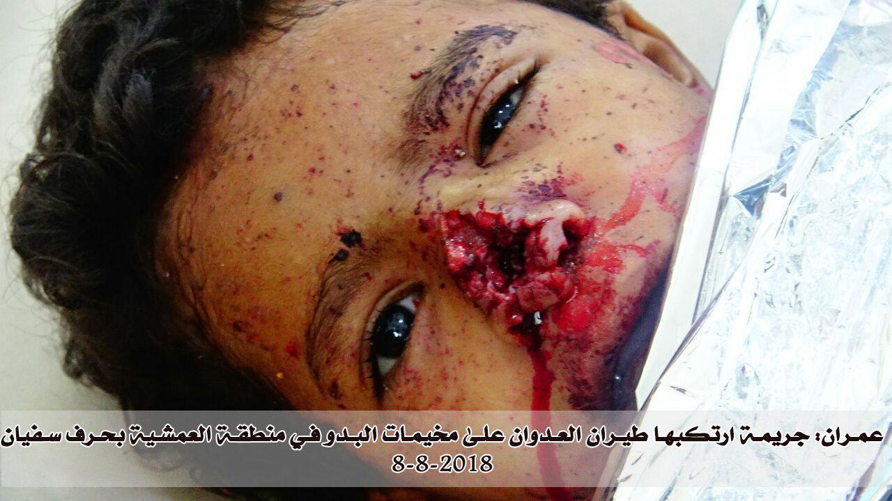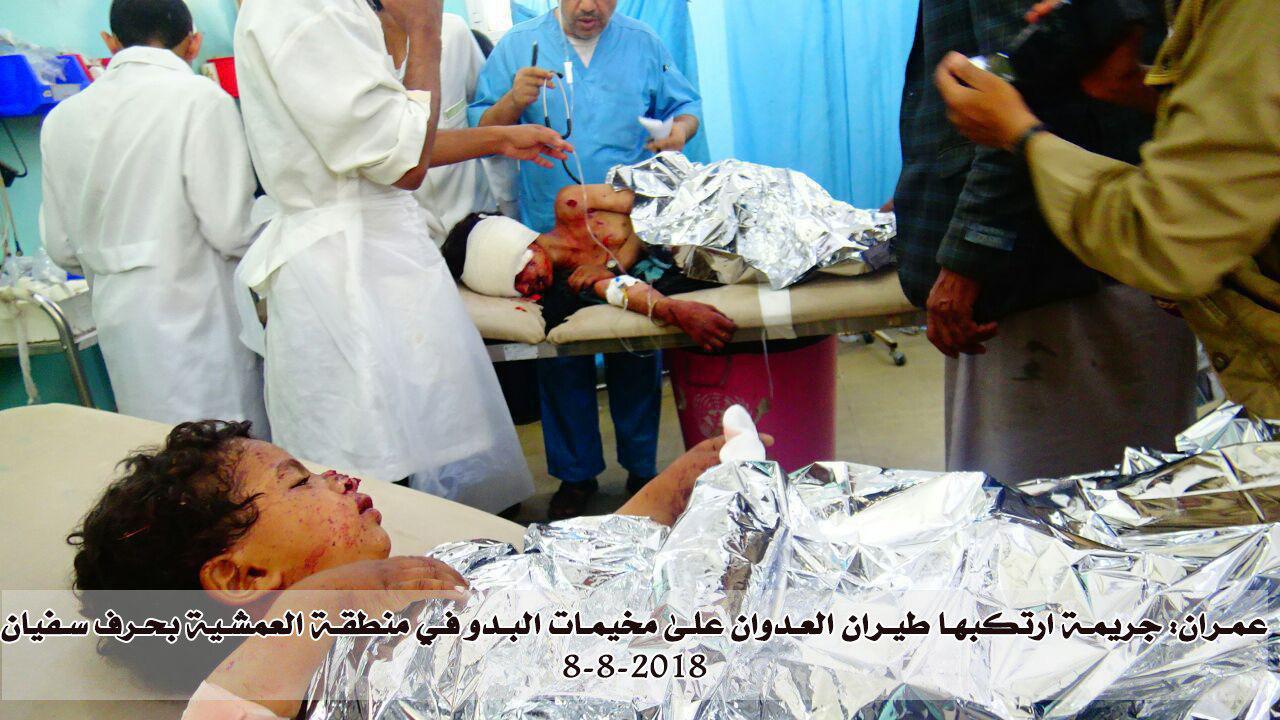 استشهد 18 مدني اليوم الأربعاء بعد معاودة طيران العدوان استهداف مخيمات للبدو في منطقة العمشية بعمران وارتكابه جريمة مماثلة في منطقة الجر بمديرية عبس بمحافظة حجة.
