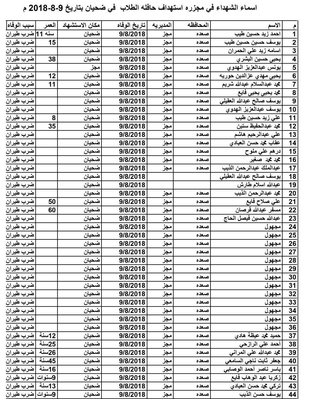 وذكر الوزير خلال مؤتمر صحفي عقده في مكان المجزرة بضحيان أن الإحصائية غير النهائية لمجزرة العدوان بحق حافلة الطلاب وسوق ضحيان وصلت إلى 131 شهيدا وجريحا.
