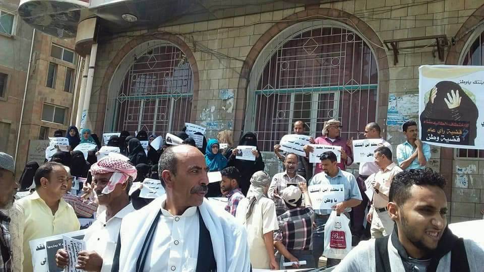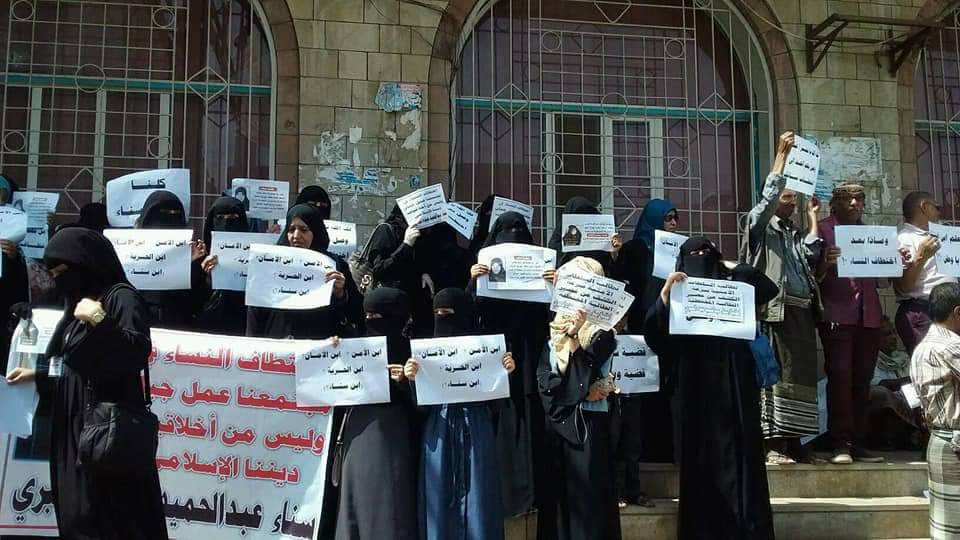 وفي السياق، نظم طلاب قسم المحاسبة بكلية العلوم الإدارية في جامعة تعز، وبمشاركة بعض القوى المدنية، صباح اليوم السبت، وقفة احتجاجية أمام مبنى المحافظة المؤقت، في شارع جمال، وسط تعز، منددين بصمت الأجهزة الأمنية جراء الجريمة الدخيلة على المجتمع التعزي. ورفع المحتجون لافتتات تعبيرية تدين جريمة الاختطاف التي تعرضت لها زميلتهم: «اختطاف سناء قضية رأي عام قضية وطن»، و«ابنتك مختطفة يا وطني».