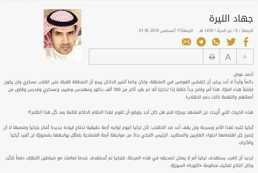 وفي مقال بعنوان “جهاد الليرة”، للكاتب السعودي “أحمد عوض”، وصف النظام التركي بـ”الظالم”، واتهمه بـ”طرد أكثر من 300 ألف دكتور ومهندس وطبيب وعسكري ومُدرس وقاضٍ من أعمالهم.. والتهمة كانت دعم الانقلاب”.
