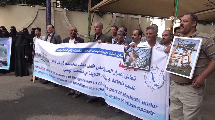 نظمت وزارة النقل ومؤسسة موانئ البحر الأحمر اليمنية وقفه احتجاجية للذكرى الثالثة لاستهداف وتدمير ميناء الحديدة في الـ17من أغسطس 2015 من قبل تحالف العدوان بقيادة السعودية.