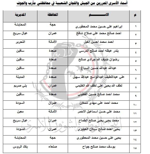 نشرت اللجنة الوطنية لشؤون الأسرى، الأحد، أسماء الأسرى الذين تم تحريرهم يوم السبت بعملية تبادل في جبهتي مأرب والجوف.
