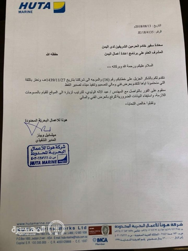 وبحسب الوثيقة فقد أرسلت الشركة المُكلفة بتنفيذ عملية إنشاء ميناء تصدير النفط “هوتا للأعمال البحرية المحدودة” والمرسلة الى السفير السعودي في اليمن محمد سعيد آل جابر المشرف على ما يُسمى بـ”ببرنامج إعادة إعمار اليمن” رسالة شكر على الثقة التي تم منح الشركة للبدء بعملية تنفيذ هذا المشروع.
