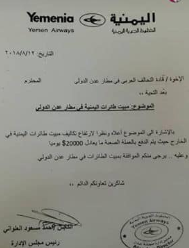 وتداول نشطاء وثيقة حملت طلبا تقدمت به الخطوط الجوية اليمنية، لتحالف العدوان السعودي بالسماح لطائراتها بالمبيت في مطار عدن.