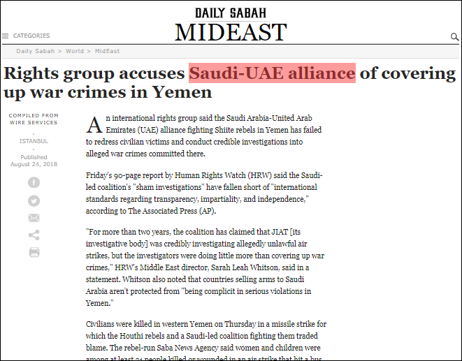 وخلال الشهر ذاته، اتّهمت منظمة “هيومن رايتس ووتش” التحالف بمفاقمة الوضع الإنساني في اليمن من خلال القيود التي يفرضها على دخول السلع الأساسية. وقالت المنظمة إنّها زادت الأوضاع المتردّية لليمنيين، وانتهكت القانون الدولي الإنساني.