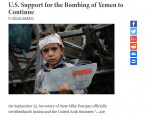 صرّح وزير الخارجية مايك بومبيو رسمياً بأن السعودية والإمارات تقومان بإجراءات واضحة للحدّ من خطر إلحاق الأذى بالمدنيين والبنية التحتية المدنية الناجمة عن العمليات العسكرية لهذه الحكومات في اليمن متناسياً السماح للطائرات الأمريكية بمواصلة تزويد الطائرات السعودية والإماراتية بالوقود، حيث لن تتمكن الأخيرة من أن تستمر في إسقاط القنابل على أهداف في اليمن لولا الأولى.