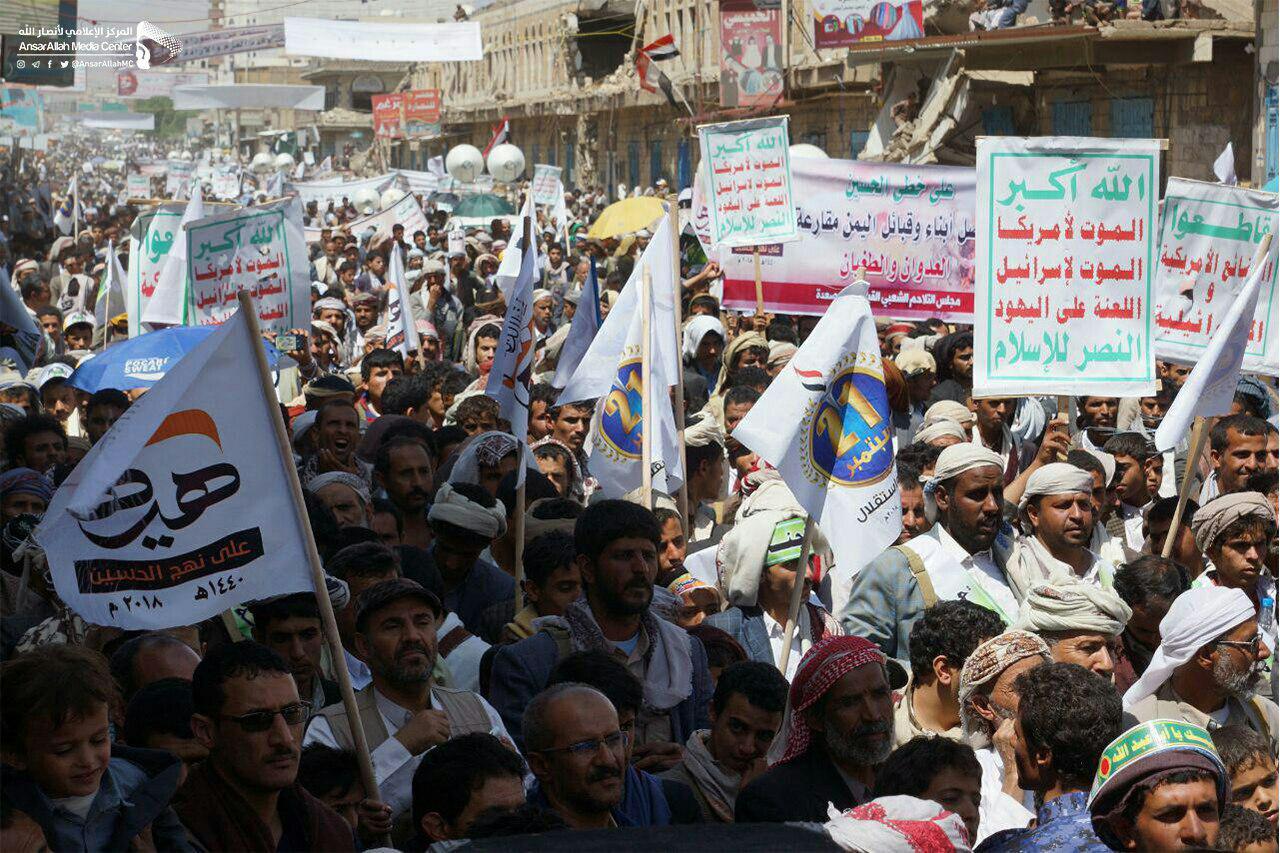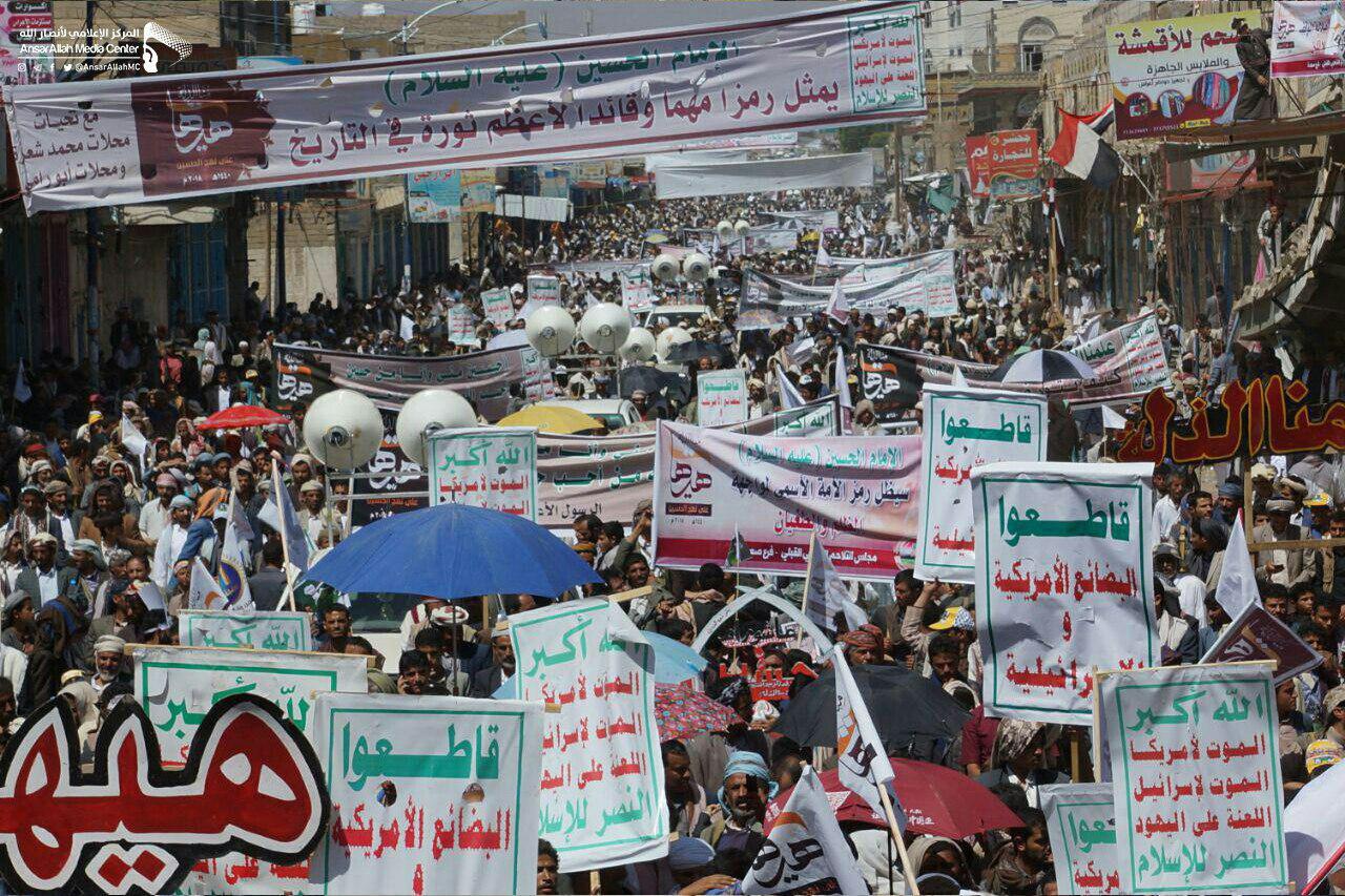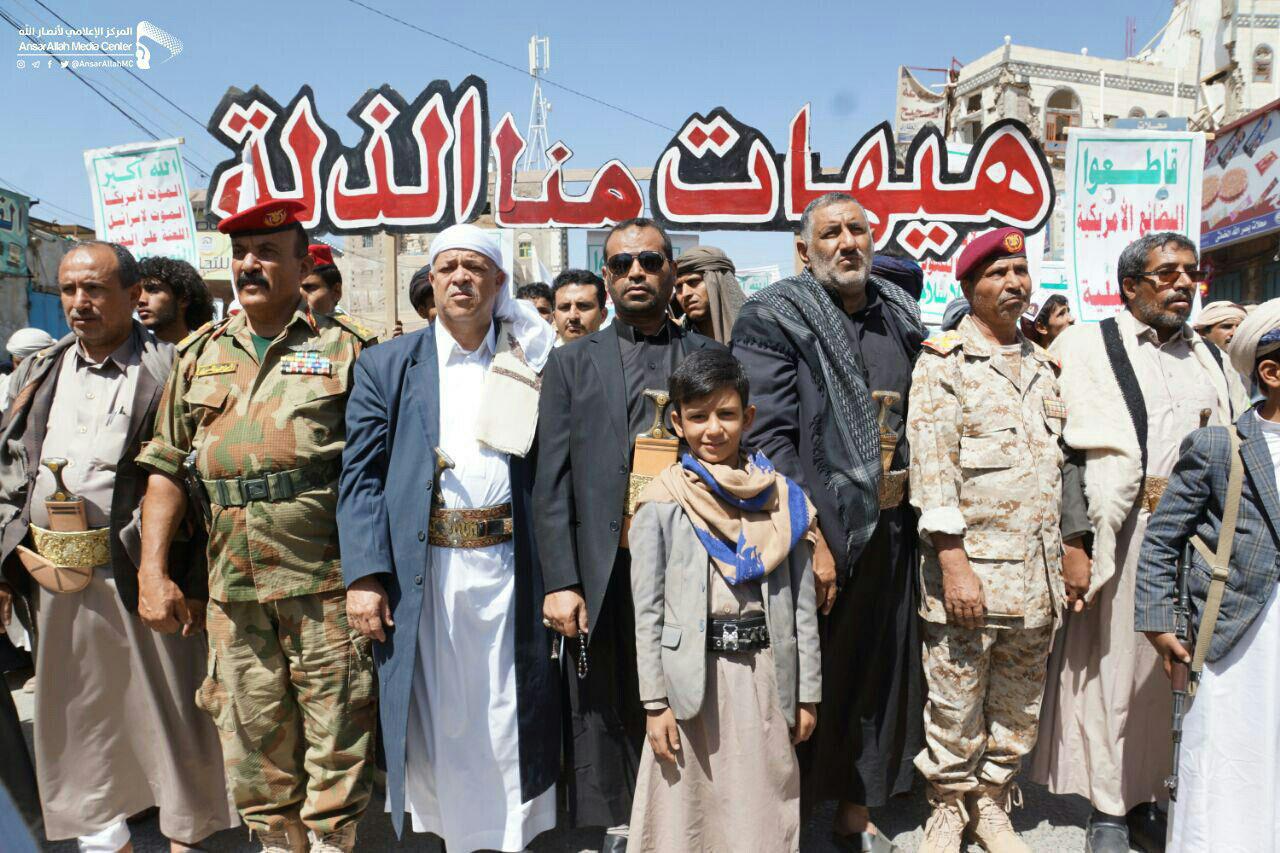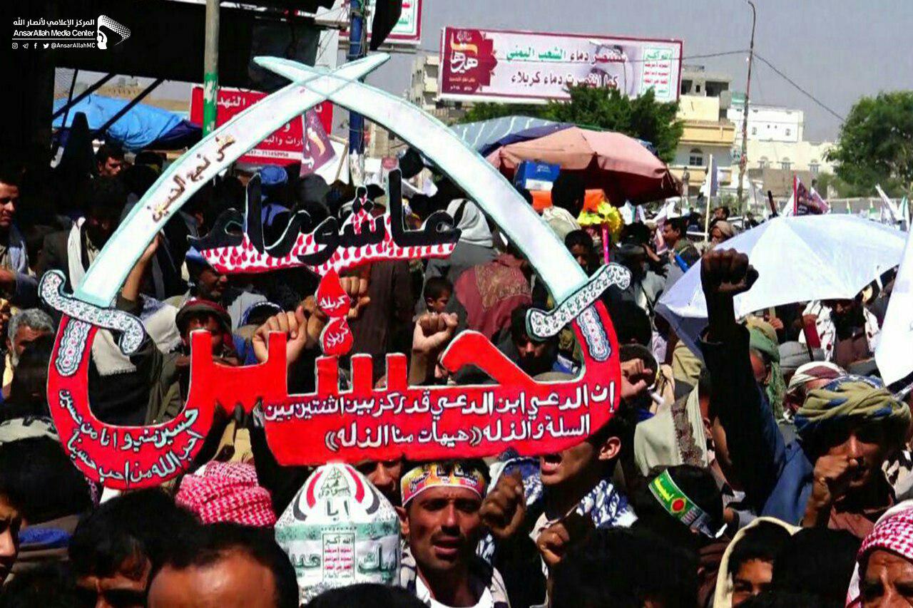 وحمل المتظاهرون أعلام وشعارات المناسبة ولافتات الحرية المناهضة للسياسية الأمريكية في المنطقة، ورددوا شعارات منها و”أحرار لسنا عبيد”، “التصعيد بالتصعيد”، و”هيهات الذله هيهات يا أبناء الولايات”، “وسنواصل في درب حسين .. لن نخضع للأمريكيين”و”ثقافة الاستشهاد.. رفضت كل الاستعباد”، و”مظلومية كربلاء.. جسدها يمن الإباء”، ويمن العزة كربلاء.. لن يخشى بطش الأعداء”..