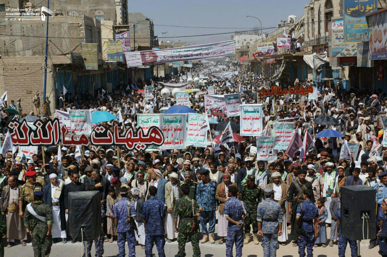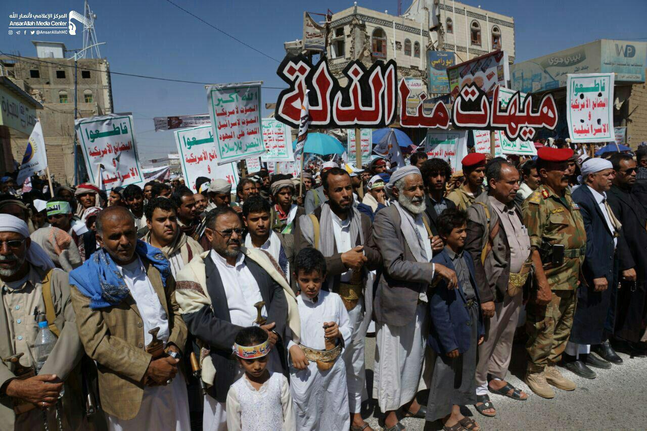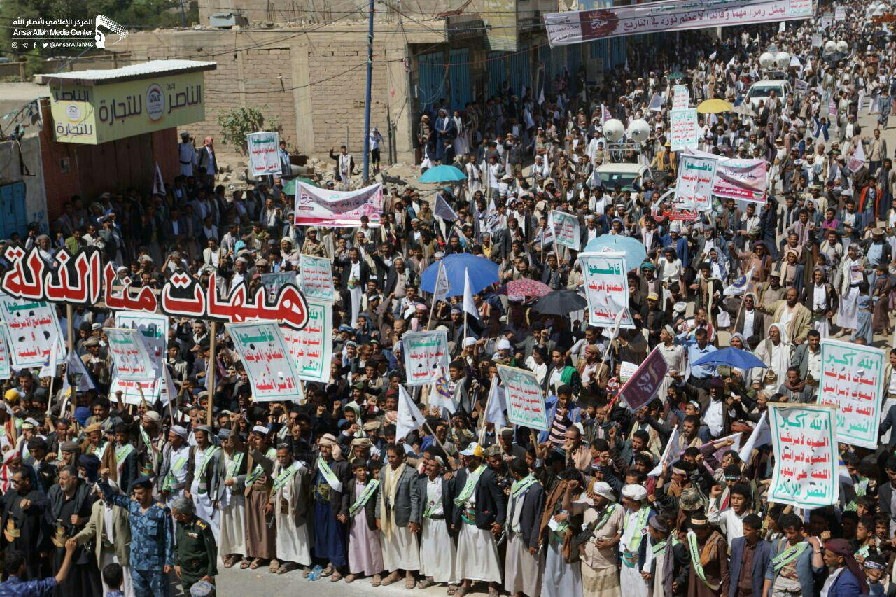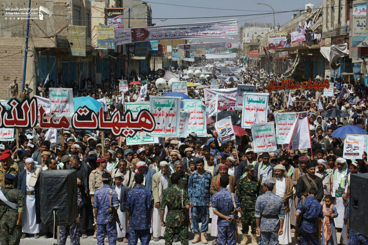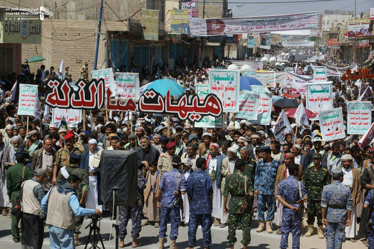وحمل المتظاهرون أعلام وشعارات المناسبة ولافتات الحرية المناهضة للسياسية الأمريكية في المنطقة، ورددوا شعارات منها و”أحرار لسنا عبيد”، “التصعيد بالتصعيد”، و”هيهات الذله هيهات يا أبناء الولايات”، “وسنواصل في درب حسين .. لن نخضع للأمريكيين”و”ثقافة الاستشهاد.. رفضت كل الاستعباد”، و”مظلومية كربلاء.. جسدها يمن الإباء”، ويمن العزة كربلاء.. لن يخشى بطش الأعداء”..