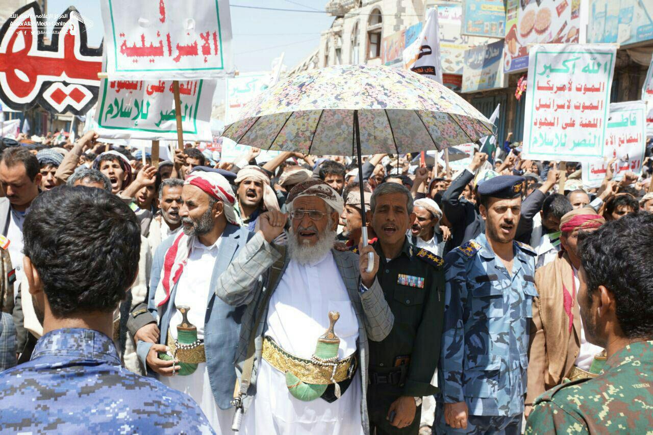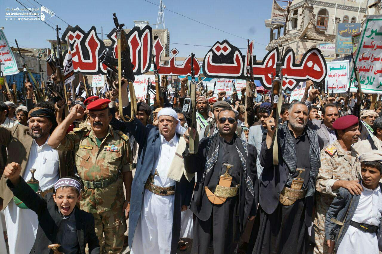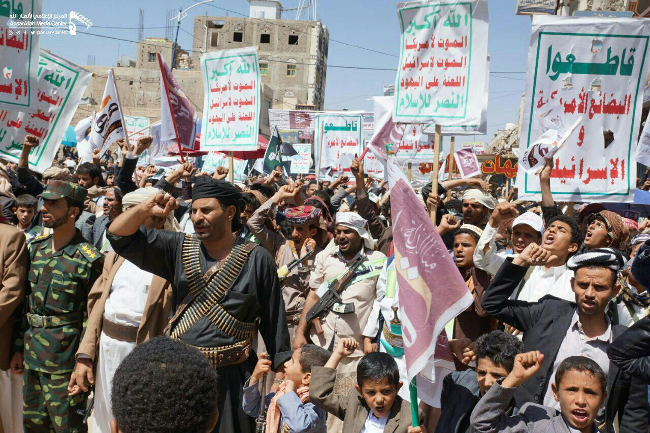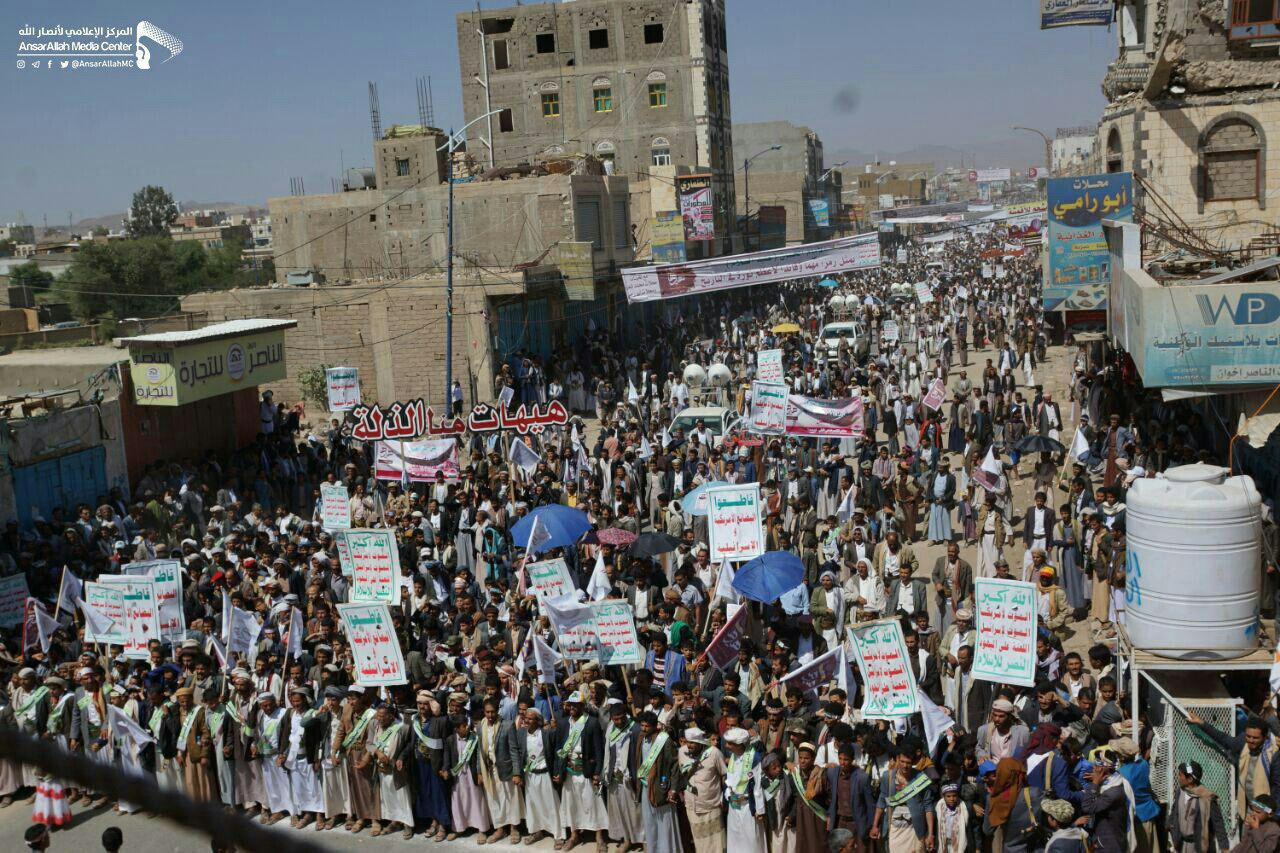 وحمل المتظاهرون أعلام وشعارات المناسبة ولافتات الحرية المناهضة للسياسية الأمريكية في المنطقة، ورددوا شعارات منها و”أحرار لسنا عبيد”، “التصعيد بالتصعيد”، و”هيهات الذله هيهات يا أبناء الولايات”، “وسنواصل في درب حسين .. لن نخضع للأمريكيين”و”ثقافة الاستشهاد.. رفضت كل الاستعباد”، و”مظلومية كربلاء.. جسدها يمن الإباء”، ويمن العزة كربلاء.. لن يخشى بطش الأعداء”..