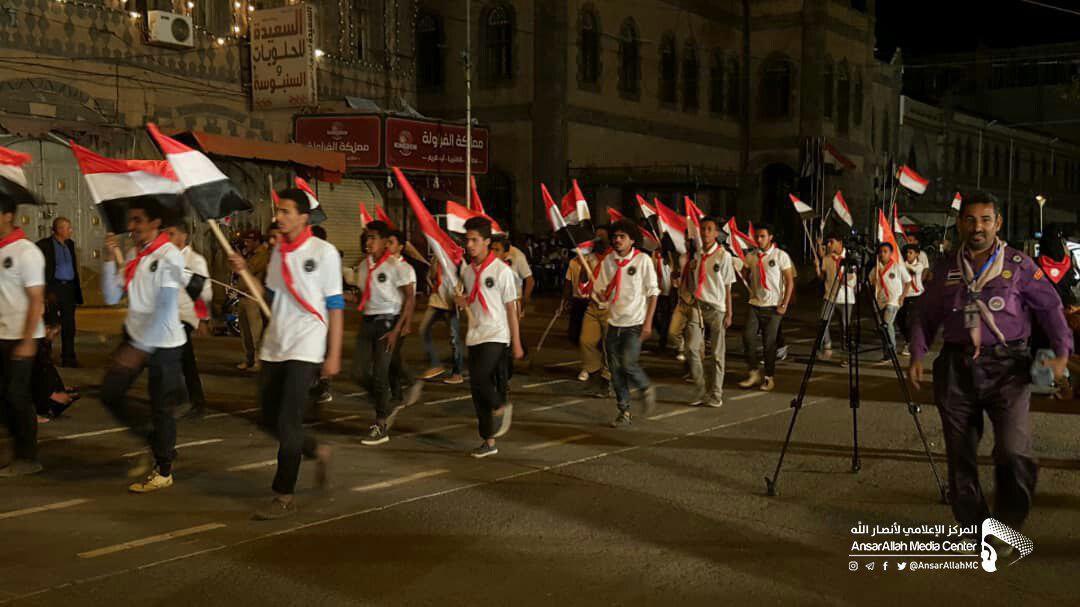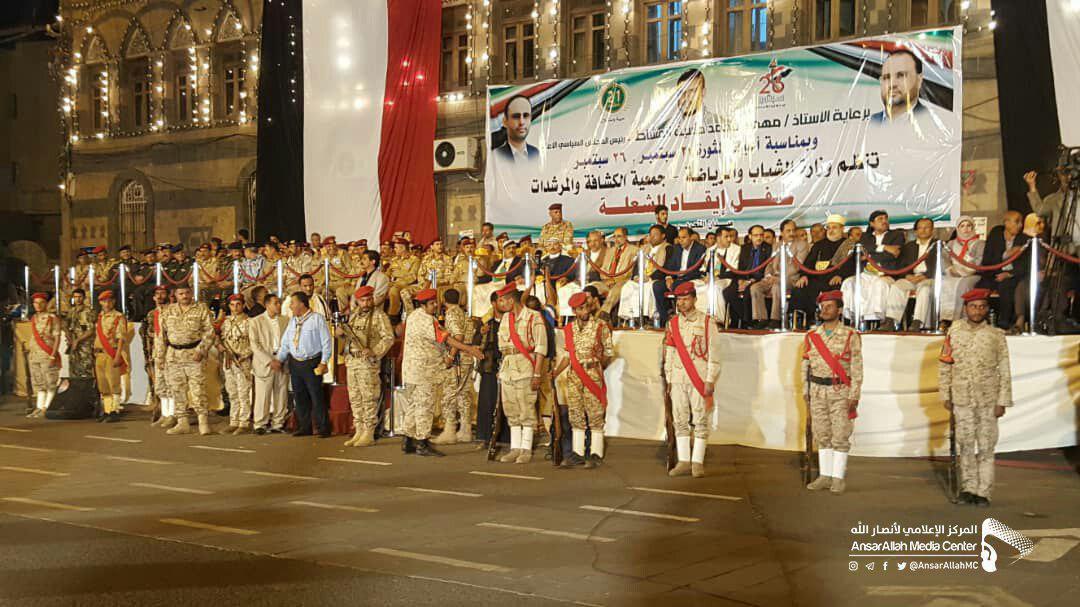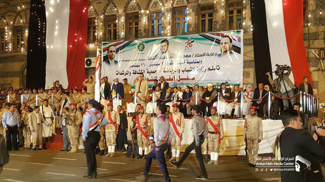 وفي الحفل الذي بدء بالسلام الوطني واستعراض حرس الشرف بحضور عضوا المجلس السياسي الأعلى ناصر النصيري وسلطان السامعي ونائب رئيس الوزراء لشؤون الخدمات محمود الجنيد ووزيرا الدفاع اللواء الركن محمد ناصر العاطفي والشباب والرياضة حسن زيد وأمين العاصمة حمود عباد وعدد من قيادات الدولة، تم الاستئذان لدخول طابور الاستعراض لشباب وفتيات الكشافة والمرشدات الذين قدموا عرضا شبابيا مصحوبا بالموسيقى العسكرية والألحان الوطنية وهتفوا بشعارات عبرت عن أهمية هذه المناسبة.