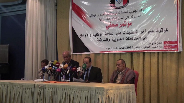 نظم الحراك الجنوبي المشارك في مؤتمر الحوار الوطني الموقع على اتفاقية السلم والشراكة مؤتمرا صحفيا في العاصمة صنعاء للوقوف على آخر المستجدات على الساحة الوطنية والأوضاع في المحافظات الجنوبية والشرقية.