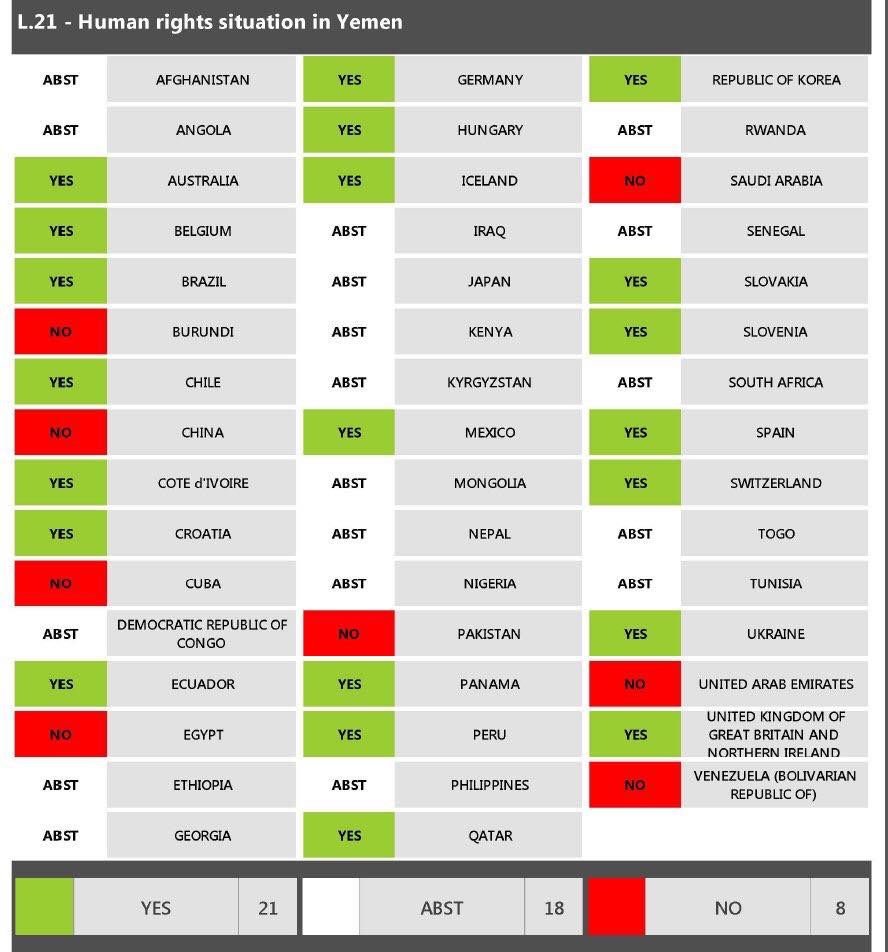 حيث وافقت 21 دولة ” صوتاً” لسرعة اجراء تحقيق دولي مقابل 8 أصوات معترضة من بينها السعودية والإمارات وحكومة هادي ومصر وفنزويلا والصين وباكستان.