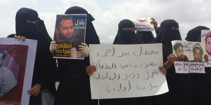 نفذت أمهات المخفيين قسراً والمعتقلين تعسفياً بسجن بئر أحمد الذي تُشرف عليه قوات الحزام الأمني التابعة لدولة الإمارات، وقفةً احتجاجية، صباح الأحد، أمام منزل وزير داخلية هادي، أحمد الميسري.