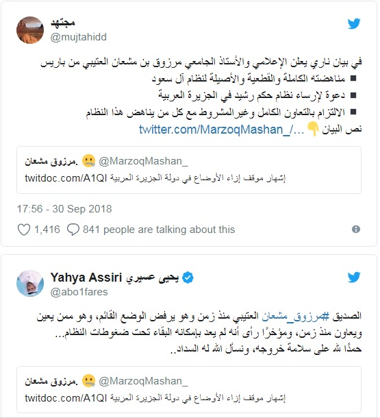 وأيد عدد من أبرز المعارضين في السعودية، بيان مرزوق العتيبي، داعين جميع المعارضين في الداخل إلى محاولة الخروج وإعلاء صوتهم كما فعل العتيبي وآخرون.