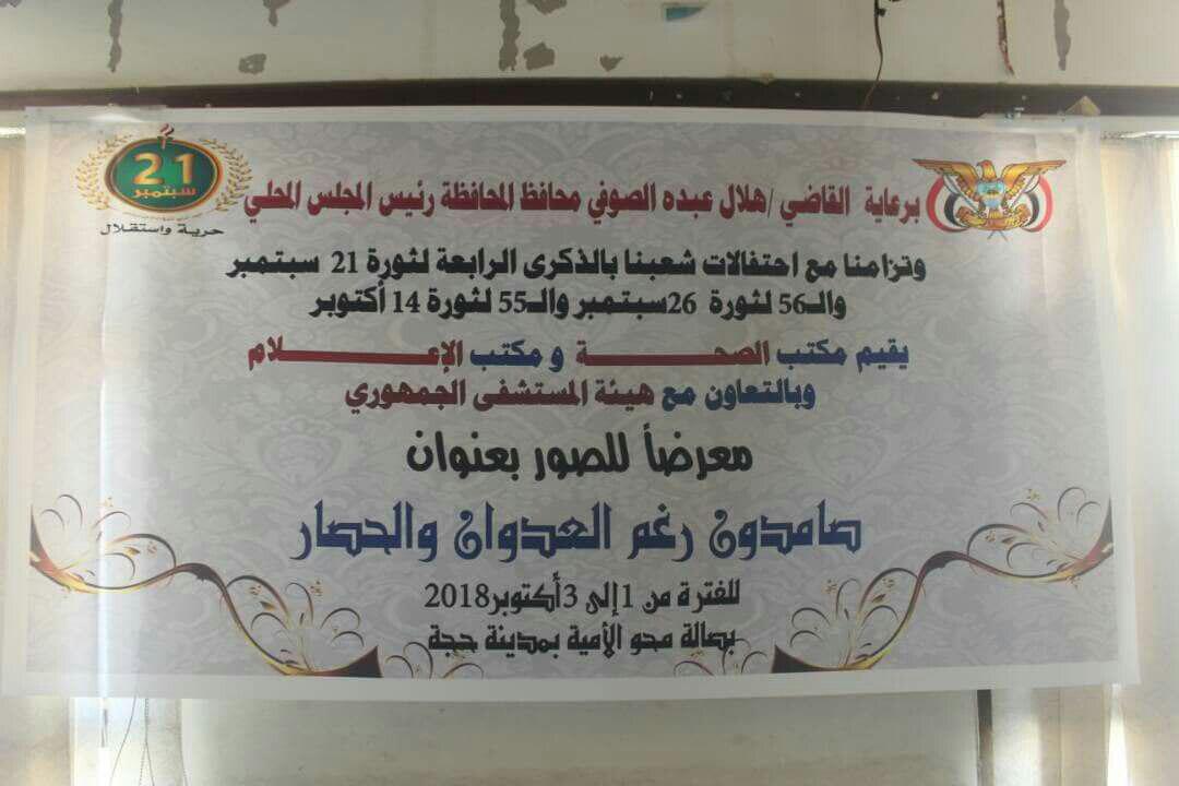 أفتتح محافظ محافظة حجة هلال عبده الصوفي، اليوم الإثنين، معرضا للصور حمل عنوان ” صامدون رغم العدوان والحصار , نفذه مكتب الصحة العامة والسكان ومكتب الإعلام بالتعاون مع هيئة المستشفى الجمهوري, تزامناً مع الاحتفالات بالعيد الرابع لثورة الـ21 من سبتمبر والعيد الـ56 لثورة 26سبتمبر والعيد الـ55 لثورة الـ14من أكتوبر.