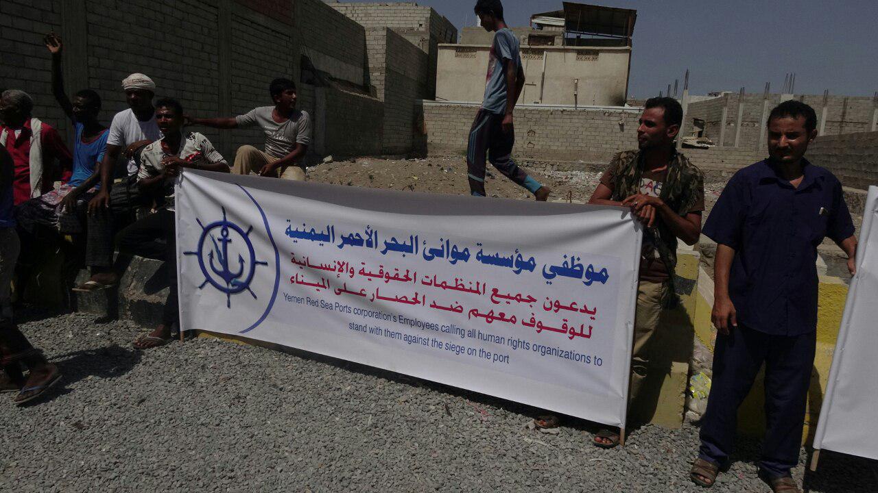 وأعلن بيان صدر عن الوقفة الاحتجاجية إدانة واستنكار عمال وموظفي المؤسسة العامة لموانئ البحر الأحمر استمرار فرض القيود على وصول المواد الغذائية والمساعدات الإنسانية والمشتقات النفطية والأدوية إلى ميناء الحديدة من قبل دول تحالف العدوان.
