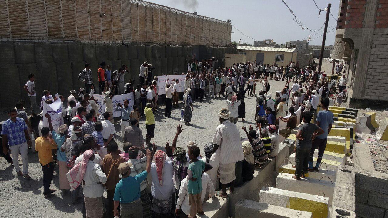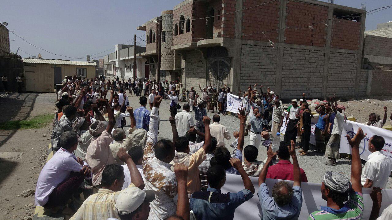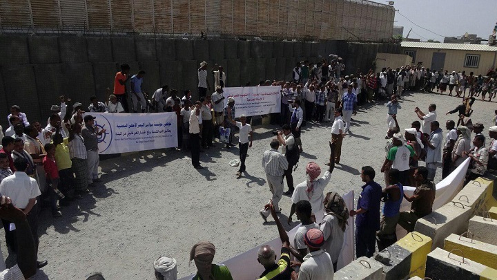 نظم عمال وموظفو مؤسسة موانئ البحر الأحمر اليمنية وقفة احتجاجية أمام مكتب الأمم المتحدة بمحافظة الحديدة احتجاجا على استمرار سياسية تجويع الشعب اليمني من خلال الحصار والعدوان على ميناء الحديدة منذ أكثر من ثلاث سنوات.