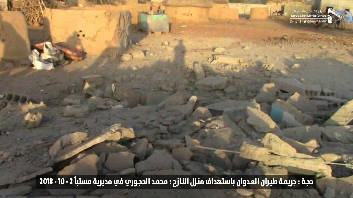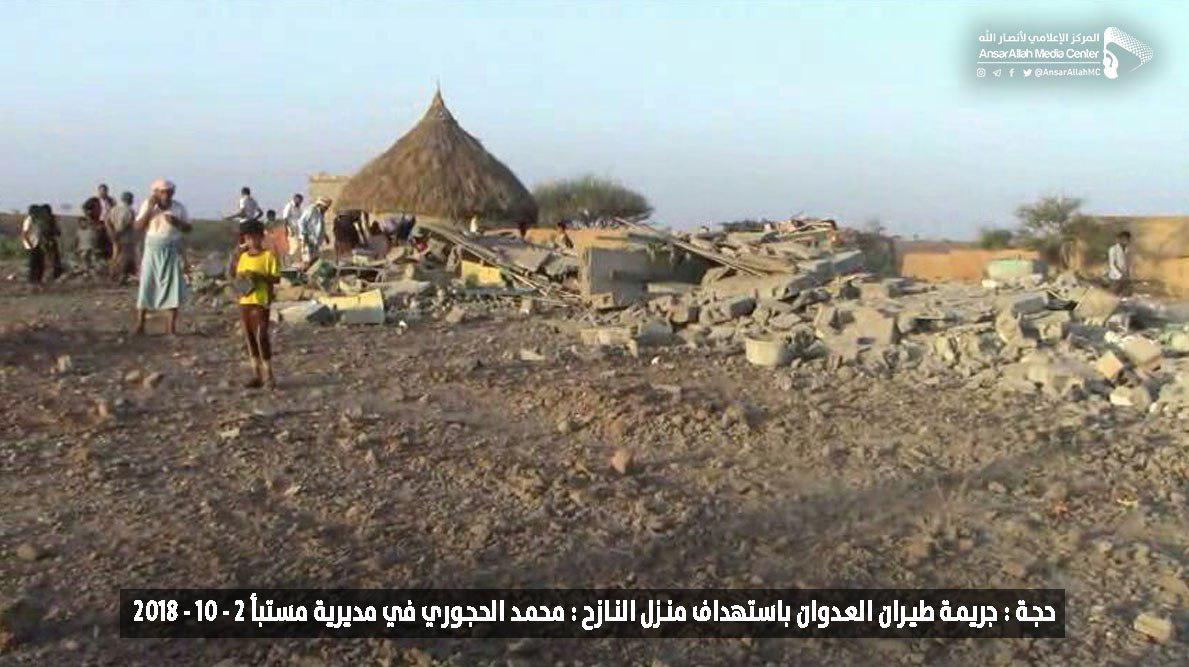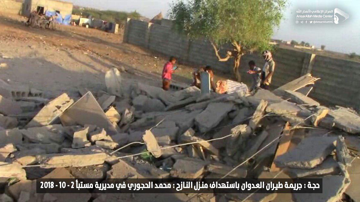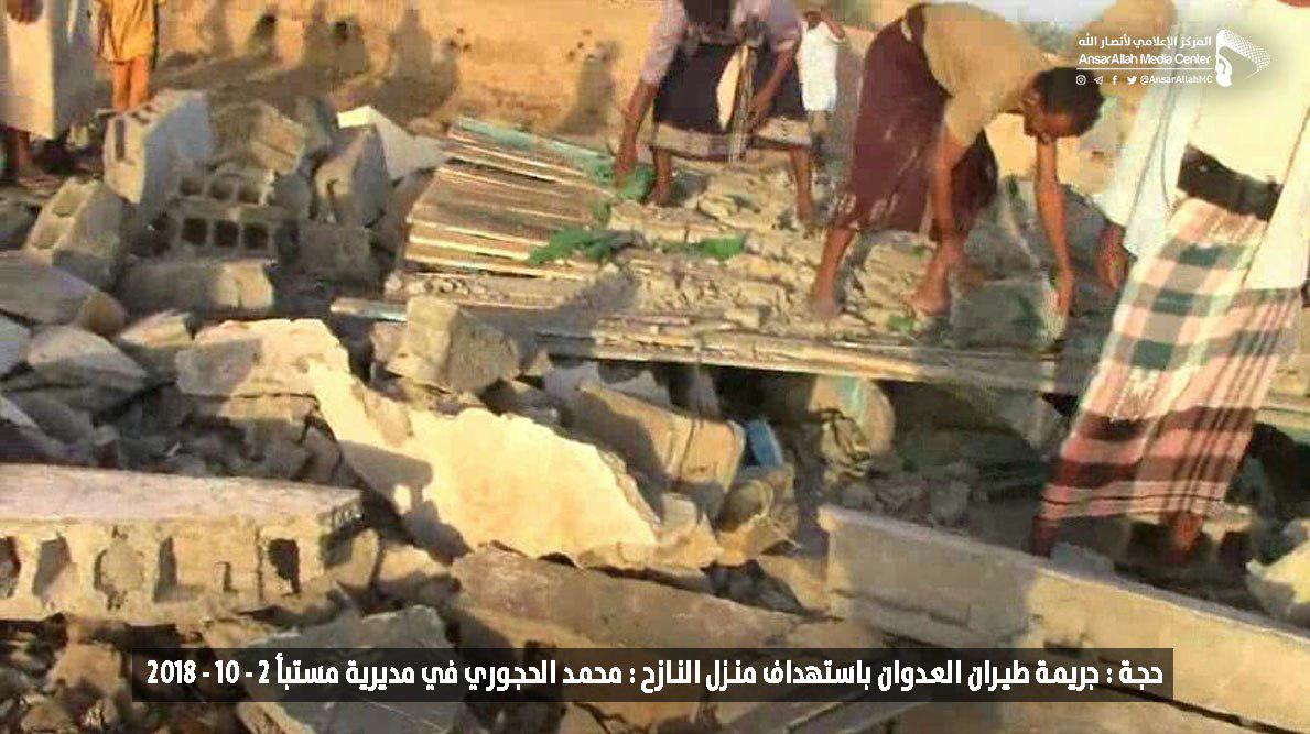وكان طيران العدوان السعودي استهدف منزل المواطن المذكور فجر الثلاثاء، ما أدى إلى تدمير المنزل وبعض المنازل المجاورة في قرية الحمراء بمديرية مستبأ.