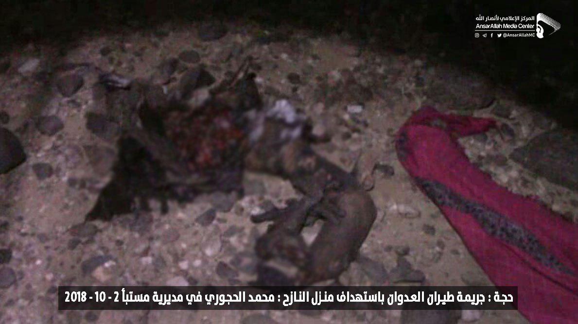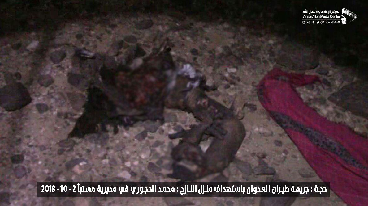 استشهد المواطن محمد علي حجوري، مع زوجته، وابنته البالغة من العمر تسع سنوات، إثر جريمة استهداف طيران العدوان السعودي الأمريكي لمنزلهم في مديرية مستبأ بمحافظة حجة (شمال غرب اليمن).