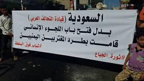 ورفع المتظاهرون لافتات تتهم العدوان السعودي باختلاق الأزمات الاقتصادية للشعب اليمني واستمرار معاناته مع الحرب والجوع والأزمات.