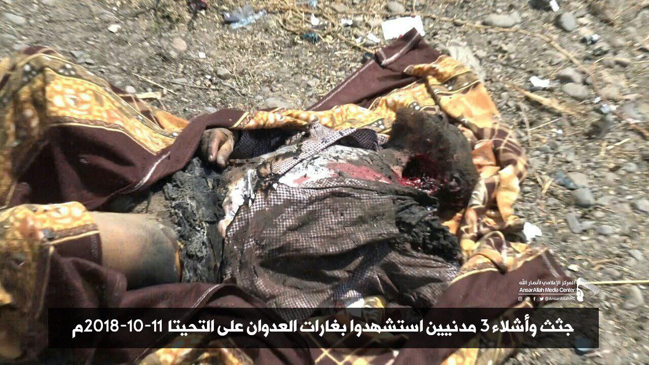 *صور جثث وأشلاء 3 شهداء استشهدوا إثر غارات شنتها طائرات العدوان على مديرية التحيتا صباح اليوم بينما الشهيد الرابع جرح في قدمه بشظية إلا أن استمرار التحليق لم يتمكن المسعفين من إنقاذه ونزف حتى الموت