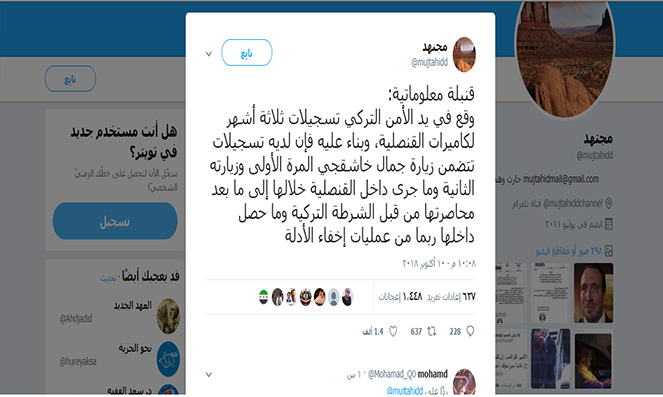 وقال مجتهد في تغريدته هذا اليوم انه وقع في يد الأمن التركي تسجيلات ثلاثة أشهر لكاميرات القنصلية، مشيرا الى ان التسجيلات تلك تتضمن زيارة جمال خاشقجي المرة الأولى وزيارته الثانية وما جرى داخل القنصلية خلالها إلى ما بعد محاصرتها من قبل الشرطة التركية وما حصل داخلها ربما من عمليات إخفاء الأدلة.