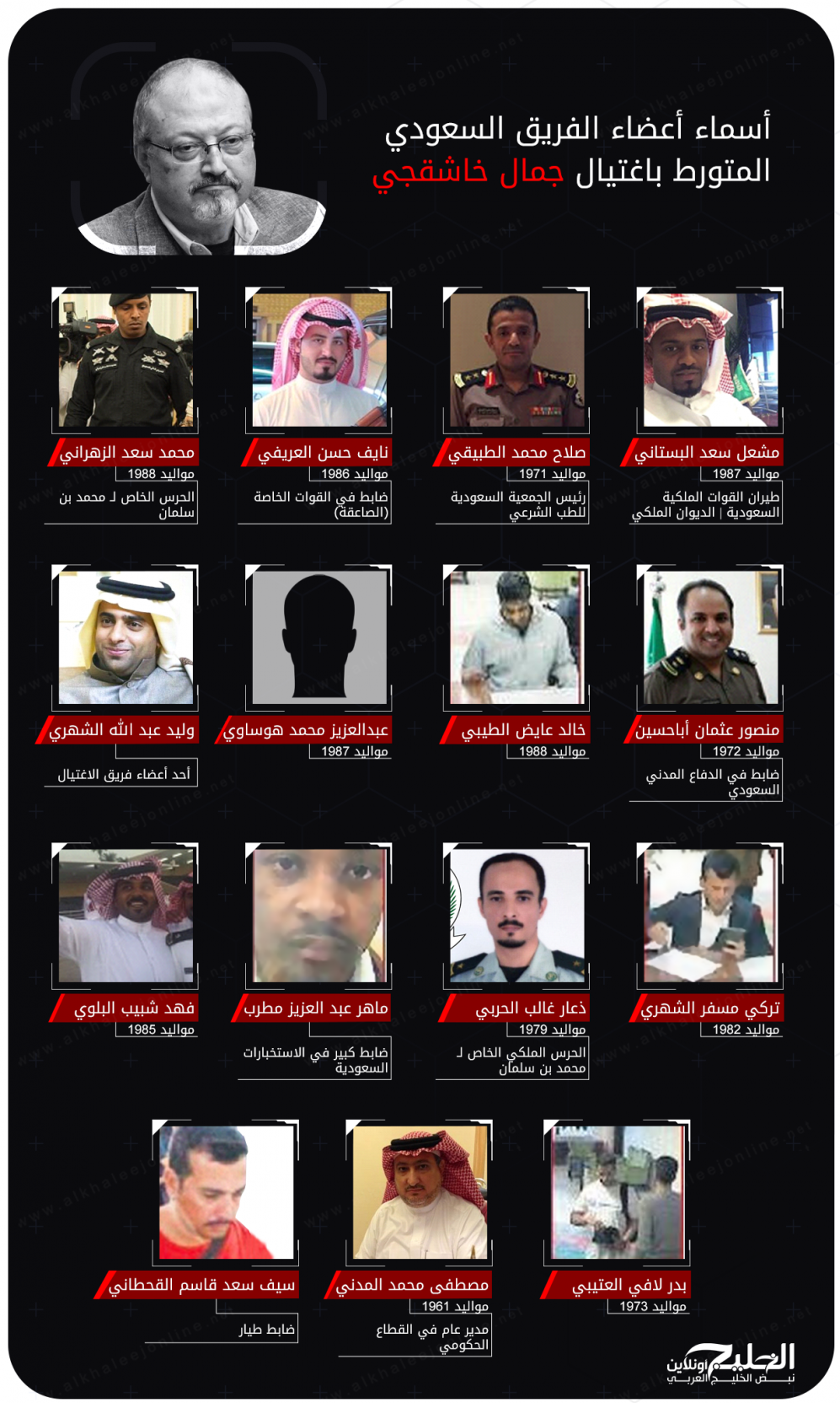 ويوم الأربعاء الماضي نشرت صحف تركية صوراً وأسماء 15 سعودياً دخلوا الأراضي التركية في اليوم نفسه الذي اختفى فيه خاشقجي بقنصلية بلاده في إسطنبول قبل أكثر من أسبوع.