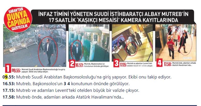 ففي الصورة الأولى يظهر مطرب ومعه عدة رجال، وهو يدخل مقر القنصلية السعودية في إسطنبول الساعة الـ9:55 صباحا بتاريخ الثاني من تشرين أول/أكتوبر، ويتبعه عدة رجال أي قبل ساعات من دخول خاشقجي للمبنى.
