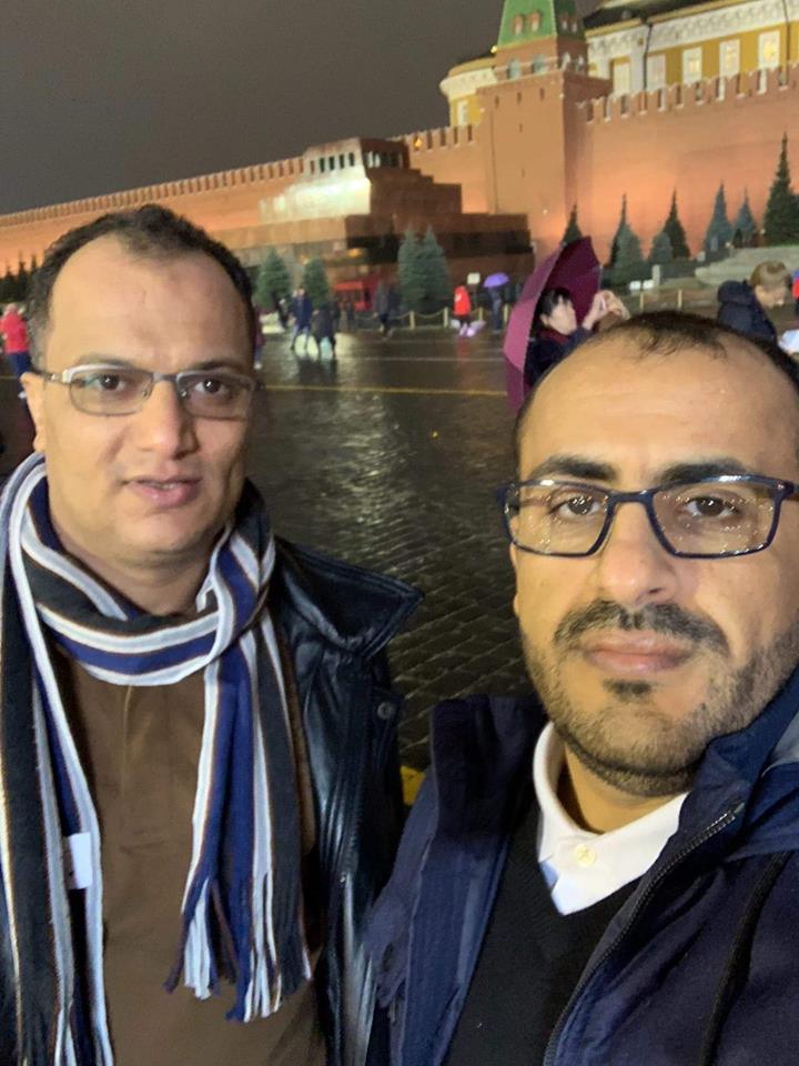ويظهر في الصورة، رئيس الوفد الوطني وناطق أنصار الله محمد عبدالسلام، برفقة عضو المكتب السياسي لأنصار الله عبدالملك العجري، أثناء تواجدهما في الساحة الحمراء بالعاصمة الروسية موسكو.